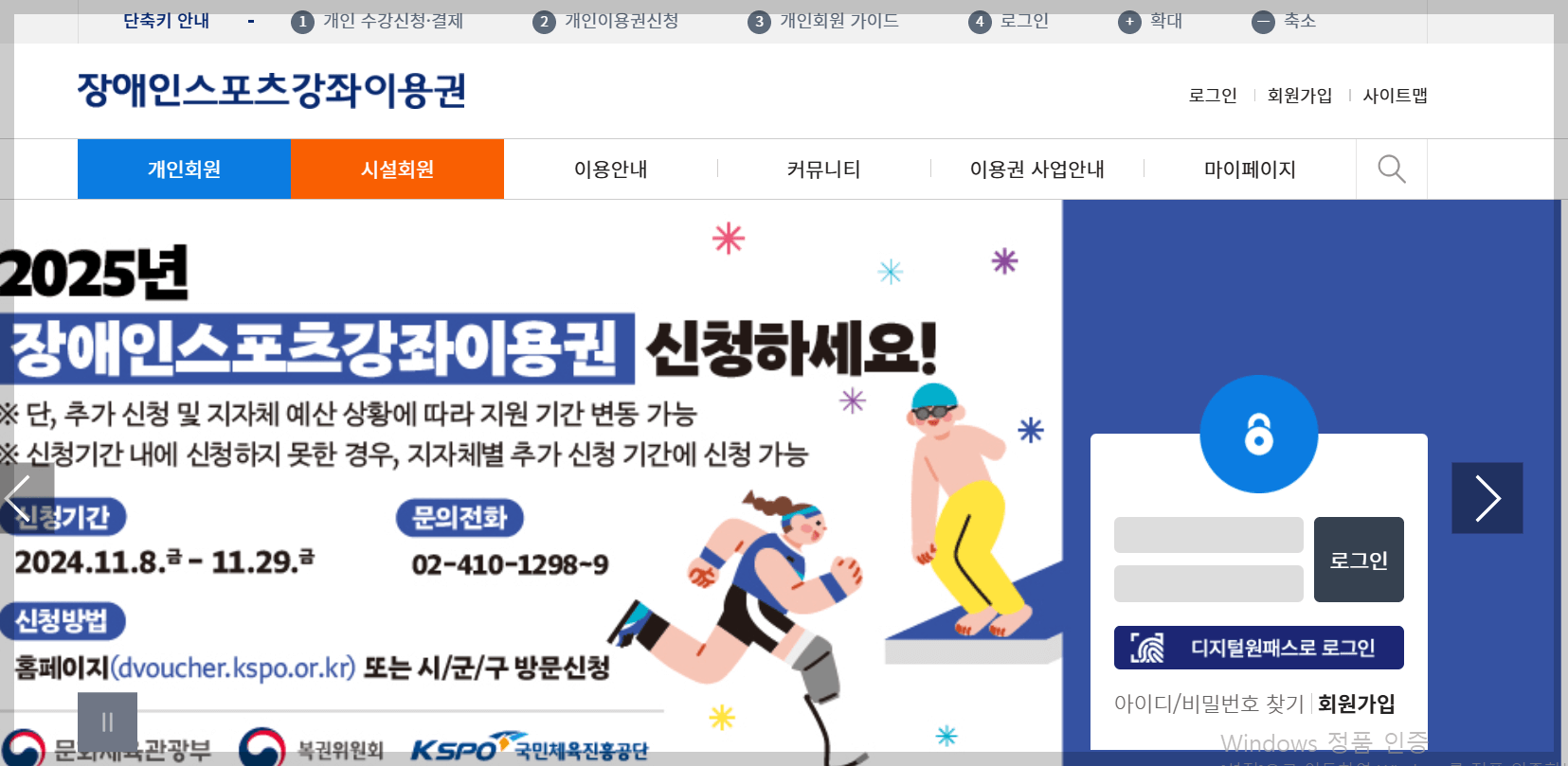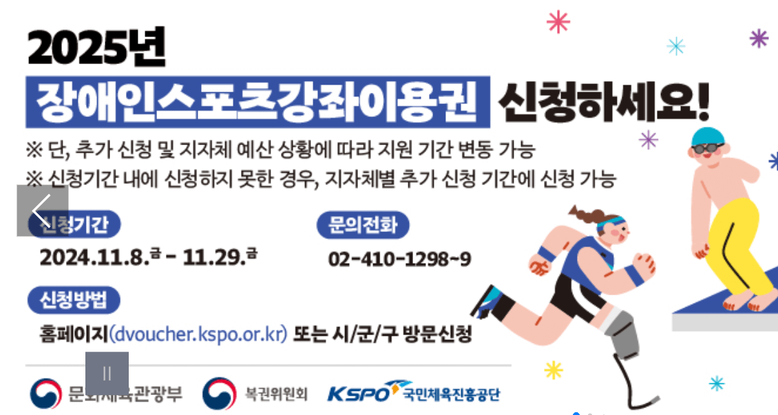 - 온라인 신청 : 스포츠강좌이용권 공식 홈페이지, 장애인스포츠 강좌이용권에 접속하여 회원가입 후 신청