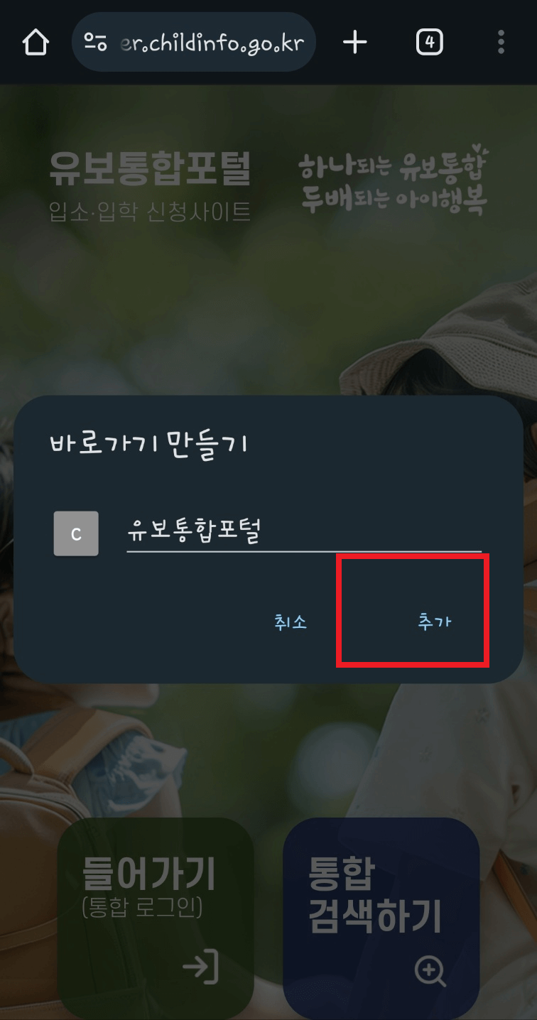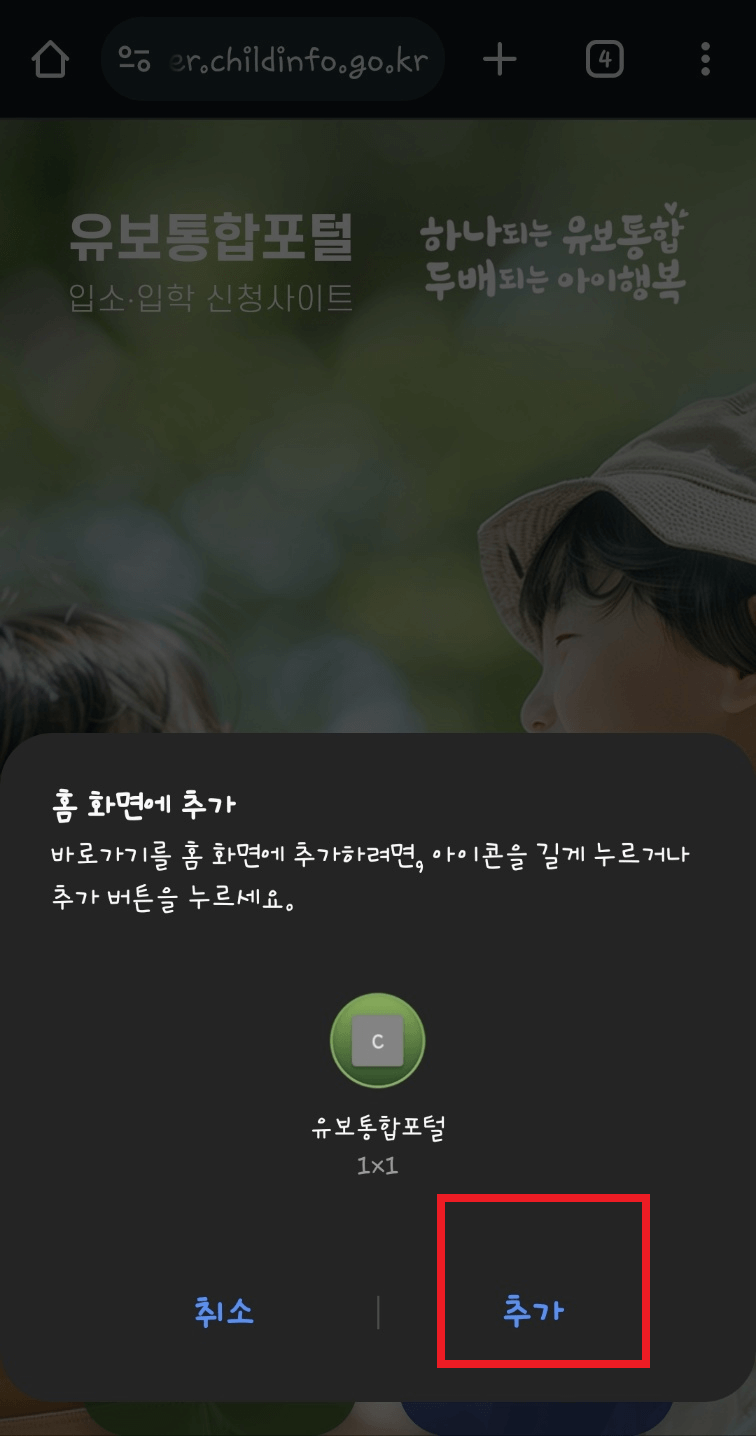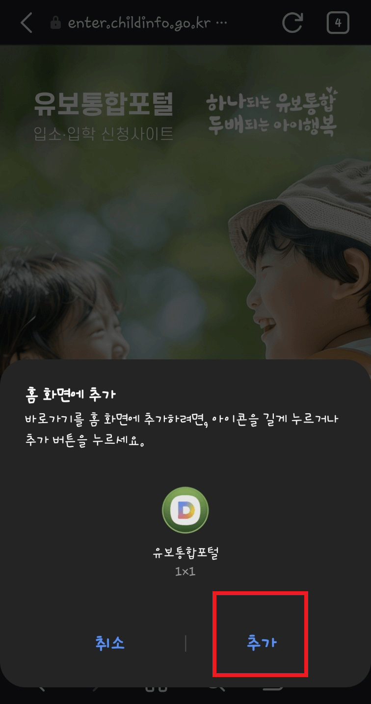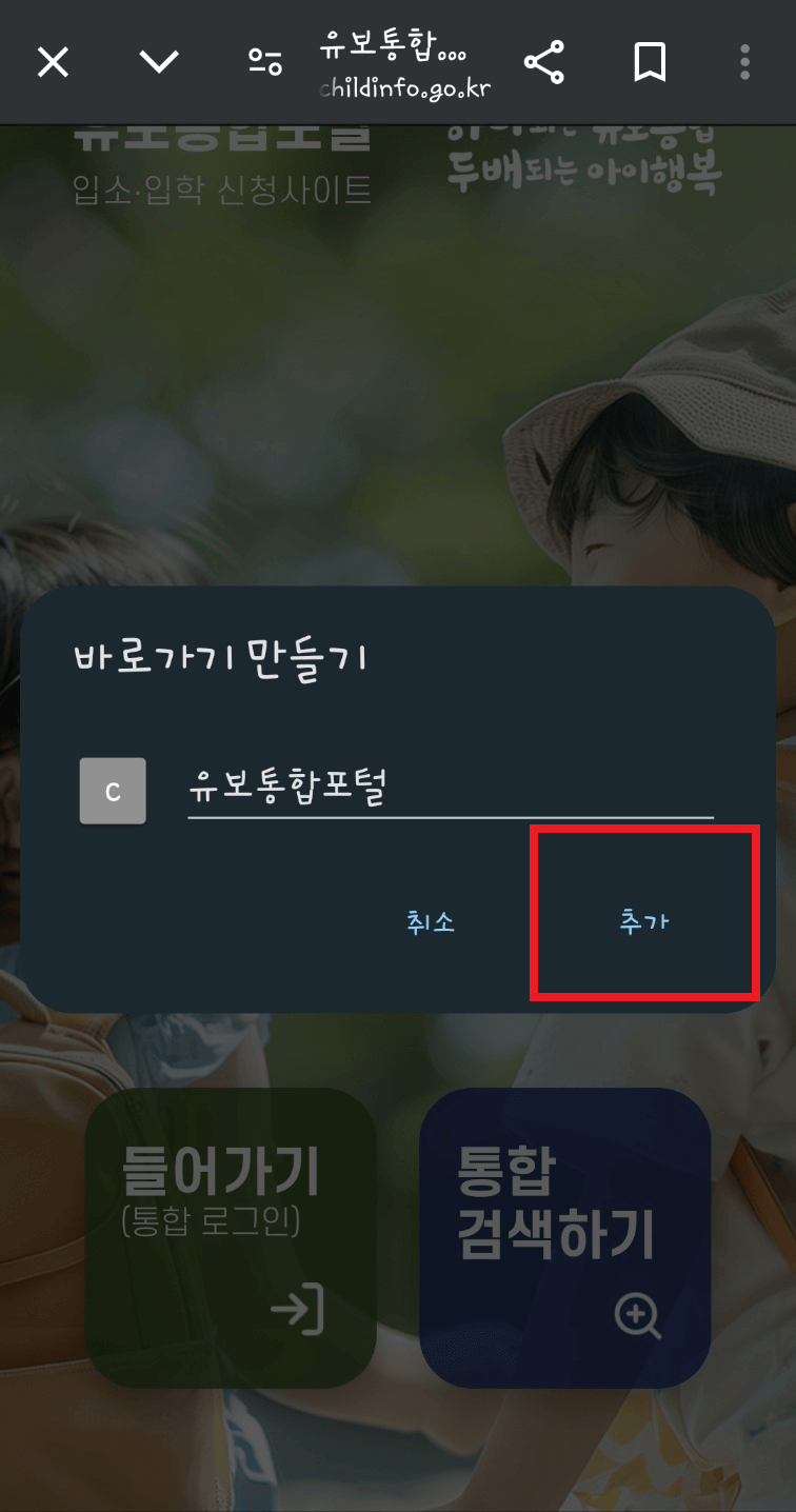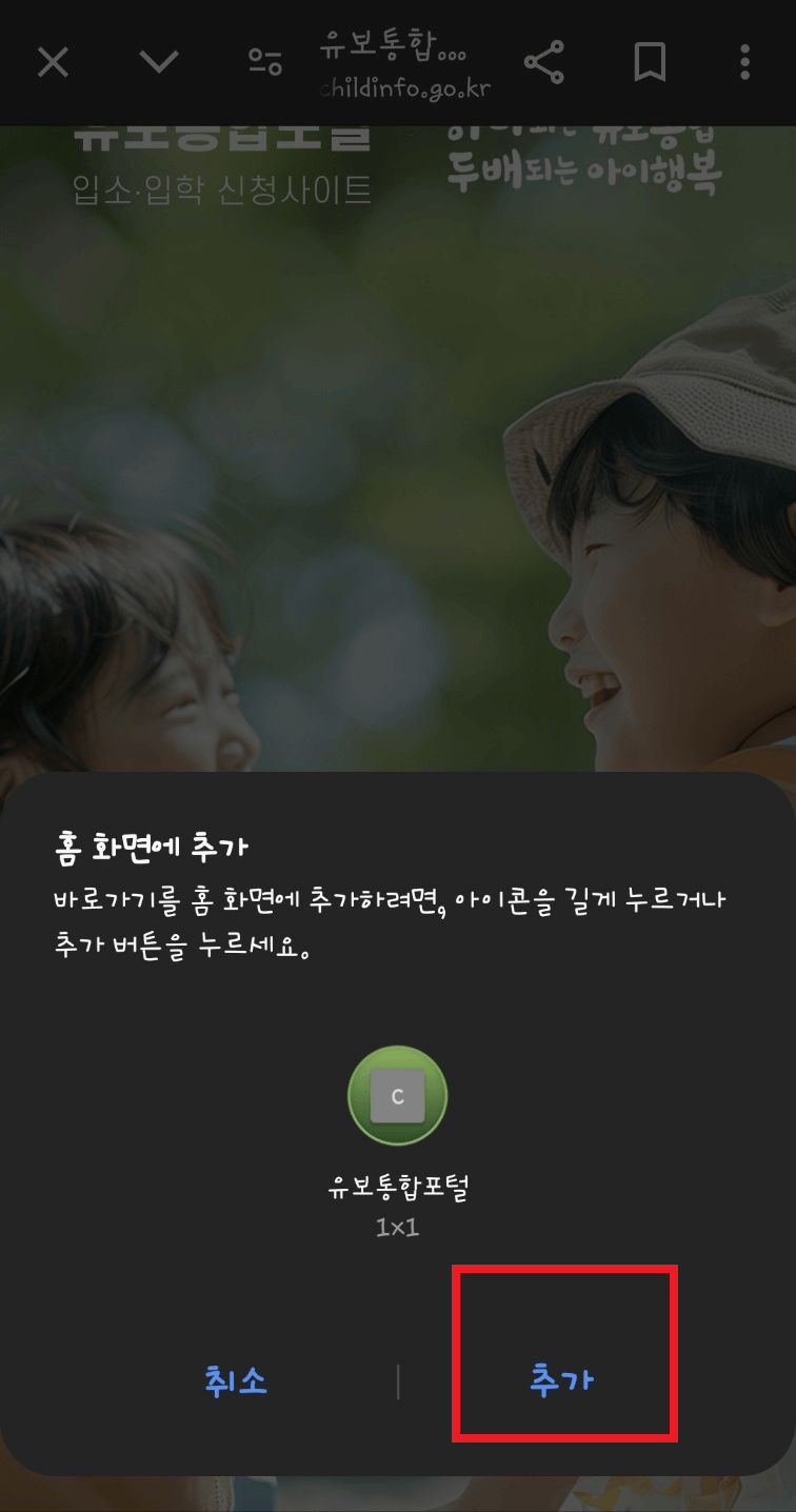 2. 아래와 같은 화며이 나오면 '추가'를 선택합니다. 스파트폰 바탕화면에 '유보통합포털' 아이콘이 생성됩니다. 이제 스마트폰에서도 유보통합포털을 어플처럼 사용할 수 있습니다.