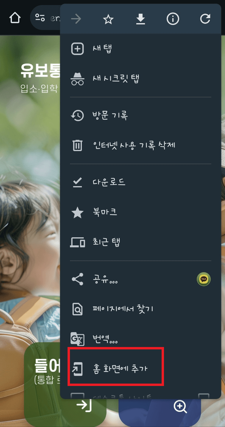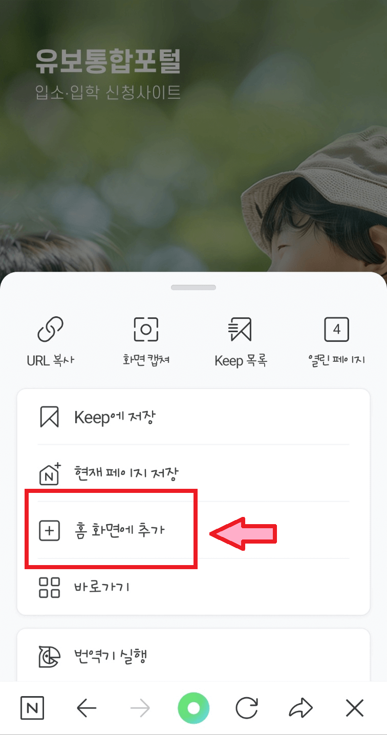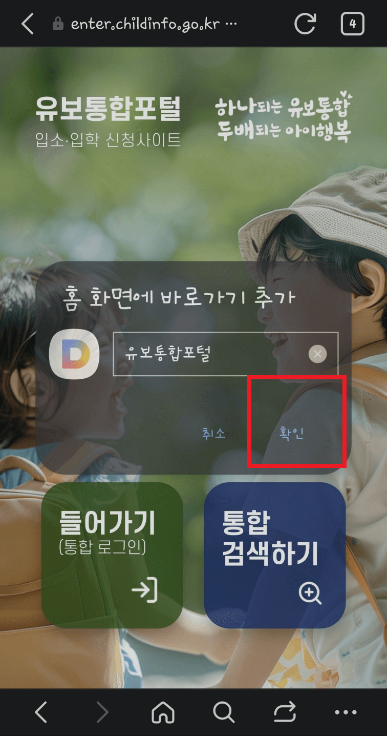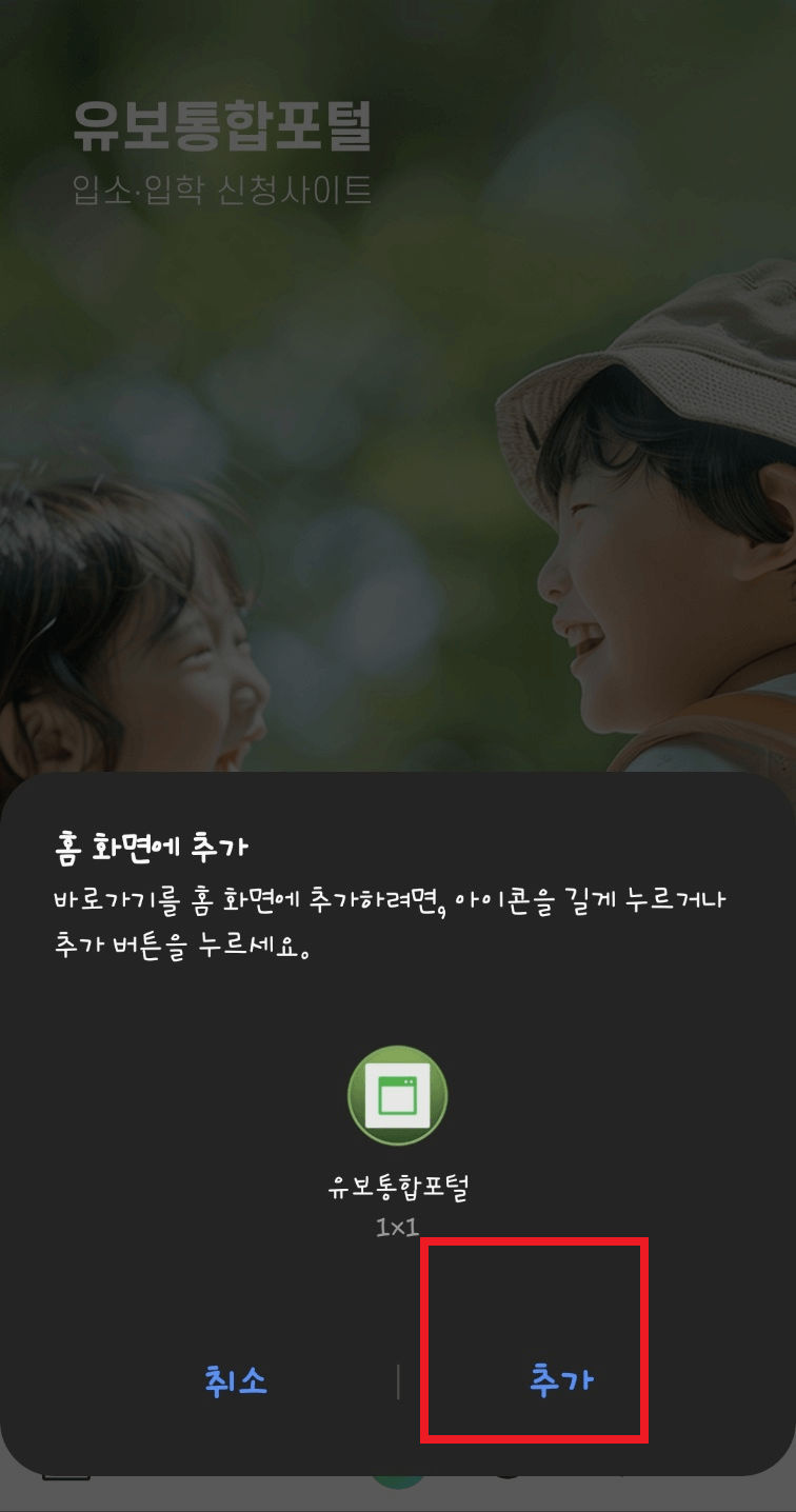 2. '추가'를 선택하면 스마트폰 배경화면에 '유보통합포털' 아이콘이 생성됩니다. 이제 어플처럼 사용하시면 됩니다.