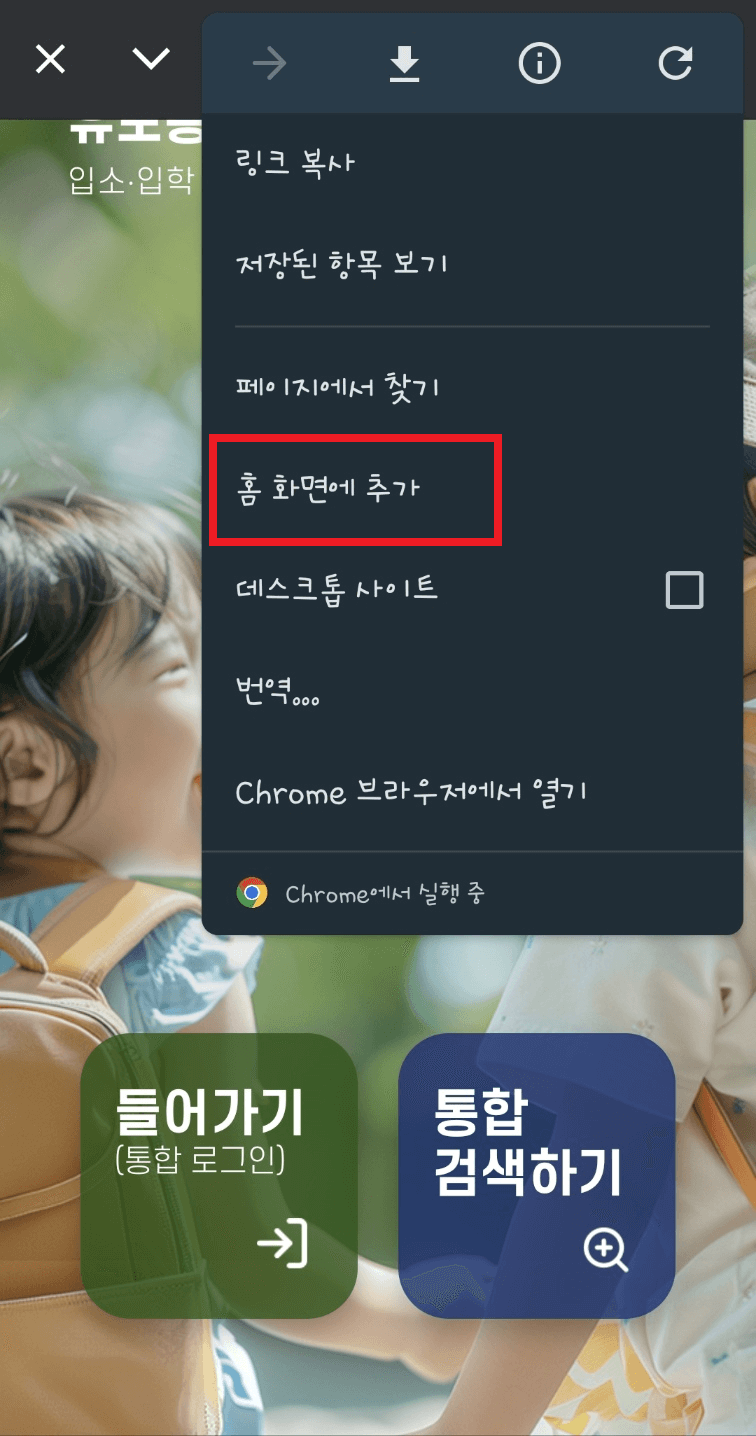 1. 크롬을 실행하고, 유보통합포털 홈페이지로 이동합니다. 위의 점 세 개를 클릭하면 가운데와 같은 화면이 나오면 '홈 화면에 추가'를 클릭하고 '추가'를 선택합니다.