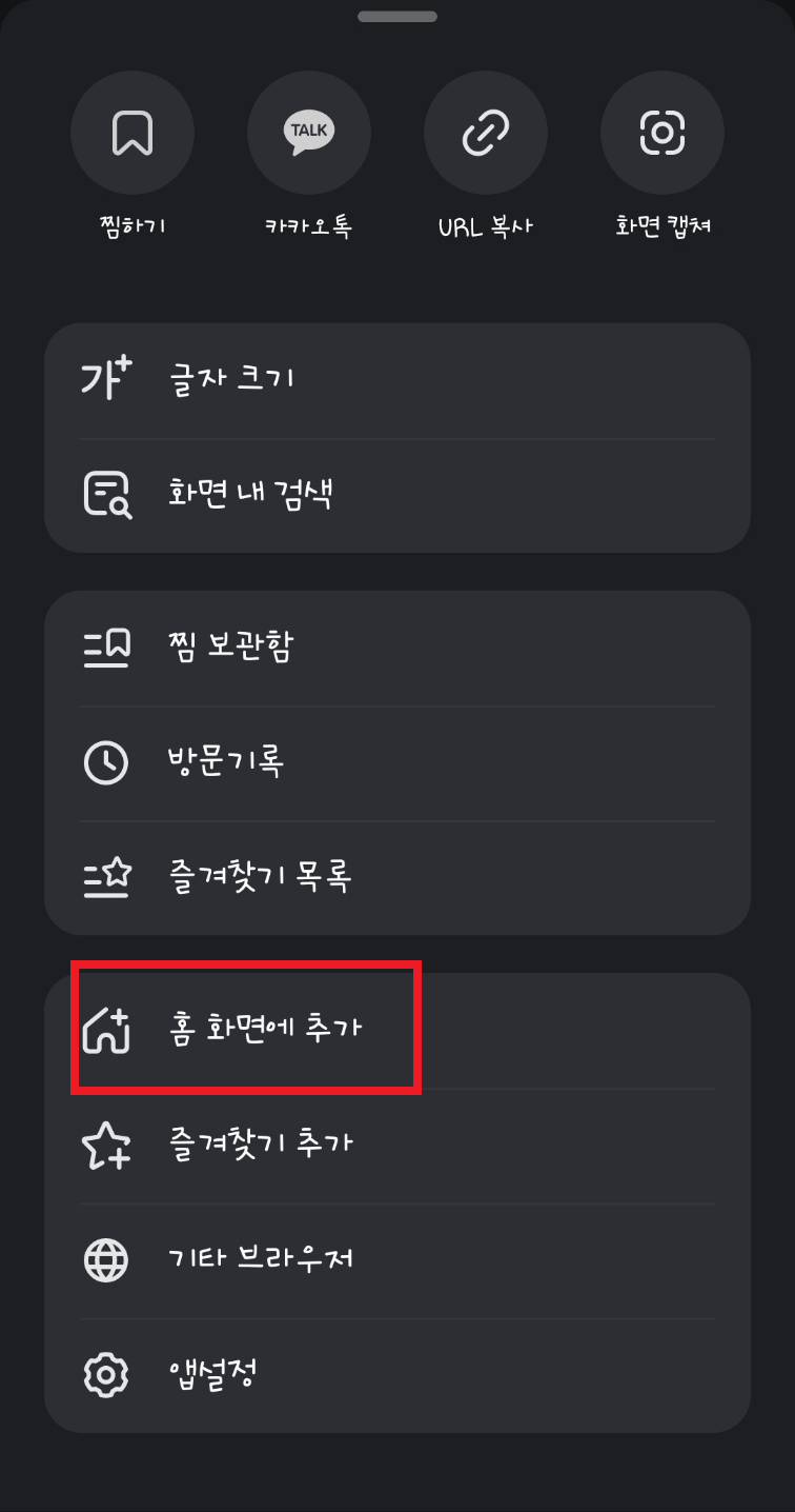 1. 네이버에서 하단의 2줄을 클릭하면 오른쪽과 같은 화면이 나옵니다. '홈화면 추가'를 선택합니다.