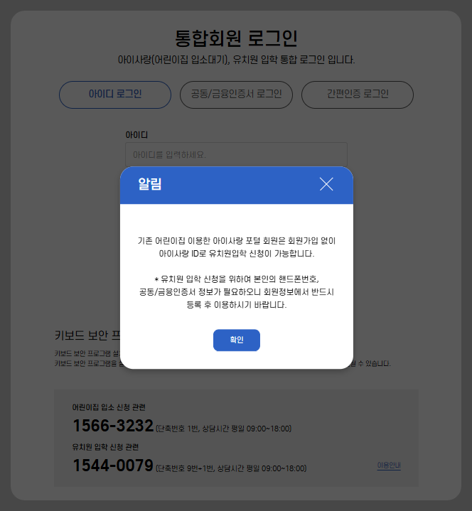 - 기존 어린이집 이용한 아이사랑 포털 회원은 회원가입 웝이 아이사랑 ID로 유치원 입학 신청이 가능합니다.