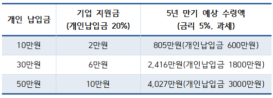 - 기업 지원금 : 근로자가 납입하는 금액의 20%를 기업이 지원합니다.