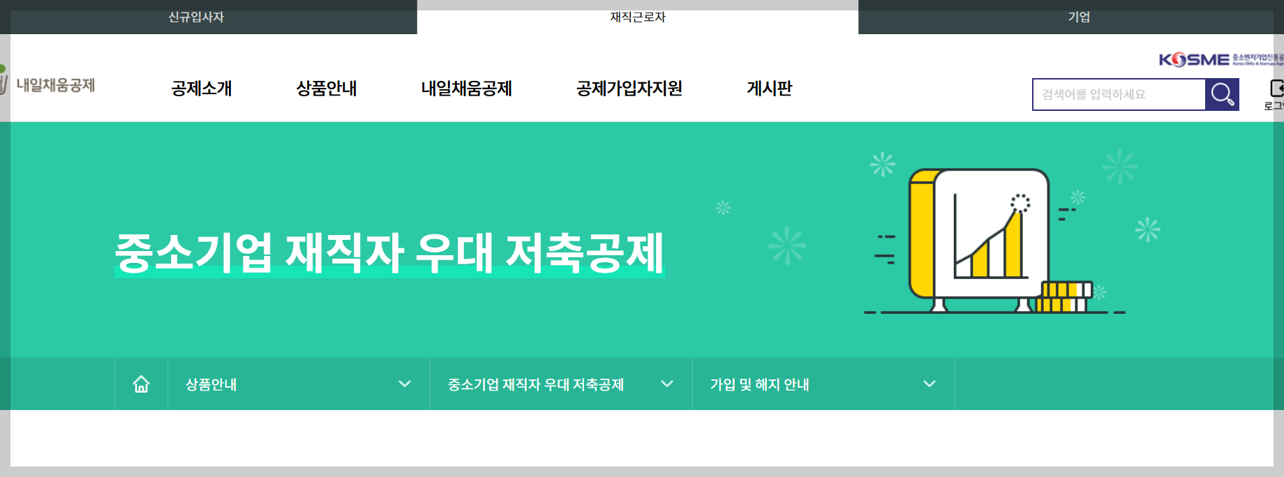 - 가입 자격 : 중소기업에 재직 중인 모든 근로자(나이, 근속 연수 무관)이며, 1일 1계좌를 원칙으로 합니다.