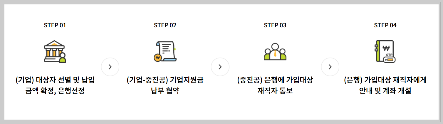 - 사전 협의 : 근로자와 기업주가 월 납입금액 및 기업 지원금 규모에 대해 협의합니다.
